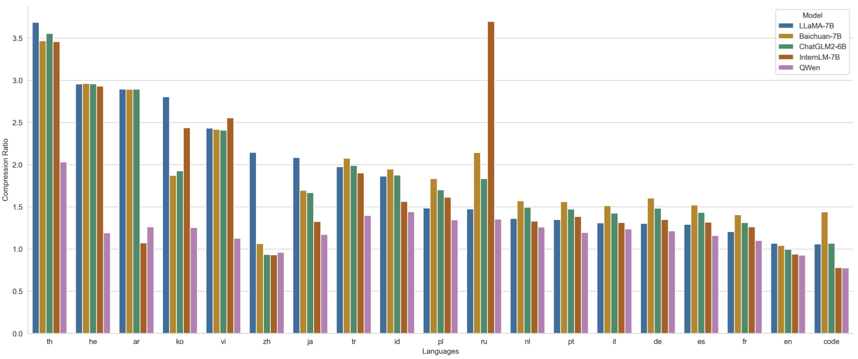 As can be seen, while ensuring the efficient decoding of Chinese, English, and code, Qwen-1.8B also achieves a high compression rate for many other languages (such as th, he, ar, ko, vi, ja, tr, id, pl, ru, nl, pt, it, de, es, fr etc.), equipping the model with strong scalability as well as high training and inference efficiency in these languages.