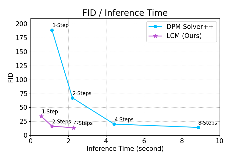 By distilling classifier-free guidance into the model's input, LCM can generate high-quality images in very short inference time. We compare the inference time at the setting of 768 x 768 resolution, CFG scale w=8, batchsize=4, using a A800 GPU.