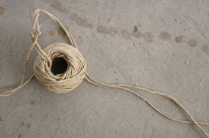 A detailed overhead close-up captures a ball of twine resting on a concrete surface. The lighting, seemingly artificial, casts a subtle shadow beneath the twine, adding depth and dimension to the composition. The twine itself boasts a rich, tan hue, its texture reminiscent of burlap. Its core is a deep, dark hole, surrounded by a thicker strand of twine that extends outward. The concrete surface, a mottled blend of light and dark gray, is speckled with spots of water, adding a touch of realism to the scene.
