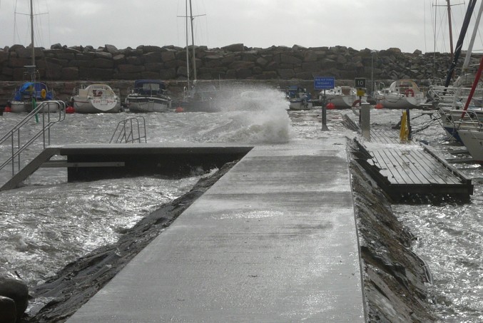 The photograph captures a serene harbor scene on a cloudy day, with a concrete dock extending from the foreground to the background. The dock, constructed from gray concrete, features a staircase leading up to it on the left, while a wooden dock extends from the right to the left of the frame. The water, a murky gray, is rough and crashes against the concrete dock, creating a spray of water in the foreground. In the background, a row of rocks forms a barrier between the dock and the water, while a fleet of sailboats is moored alongside the rocky barrier. The sailboats, a mix of white and gray, are arranged in two rows, with the white ones positioned closer to the dock and the gray ones further away. The photograph is bathed in the soft, diffused light of the overcast sky, casting a gentle glow on the scene.