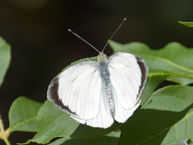 A butterfly, captured in a close-up shot at eye-level, is perched on a vibrant green leaf. Its wings, fully spread, reveal a striking contrast - the upper sections are predominantly white, while the lower sections are adorned with a darker gray hue. The butterfly's antennas, long and slender, reach skyward, adding a dynamic element to the composition. The backdrop, though blurred, hints at a forest or garden setting, enhancing the overall visual appeal of the photograph.