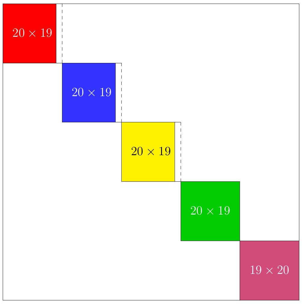 Commentaire des correcteurs : Le problème n'a pas été beaucoup résolu par les élèves qui l'ont abordé. Dans l'ensemble, une bonne partie des élèves ont trouvé une configuration qui marchait pour $\mathrm{N}=1900$, qui était bien la réponse maximale. Mais peu d'entre eux ont montré qu'on ne pouvait pas faire mieux, beaucoup se sont contentés de dire qu'en partant de la configuration qu'ils avaient donnés, on ne pouvait pas colorier plus de cases : mais ceci ne veut pas dire qu'on ne peut pas trouver une autre configuration, complètement différente (et qui ne part pas de la configuration à $\mathrm{N}=1900$ ), avec plus de cases coloriées. Enfin, un certain nombre d'élèves sont partis du principe qu'il devait forcément y avoir le même nombre de ligne et de colonne par couleur, et ont abouti à 1805 : mais la contrainte était d'avoir le même nombre de cases par couleur au total, aucune condition ne portait sur le nombre de lignes et de colonnes par couleur, et d'ailleurs les configurations optimales n'ont pas le même nombre de lignes et de colonnes par couleur. Enfin, certains élèves avaient le bon raisonnement, mais ont oublié de répondre à la question de l'énoncé, qui était "quel est le plus grand nombre de cases possibles à colorier dans la grille" : on souligne l'importance de bien se relire et d'être sûr qu'on a bien répondu à la question posée avant de rendre une copie.