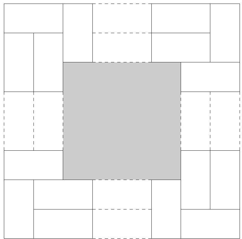 Cas $n \geqslant 8$ : Nous allons donner pour tout entier $n \geqslant 8$ un pavage de la grille $n \times n$ tel que toute ligne coupant le tableau en deux parties non vides intersecte au moins un domino.