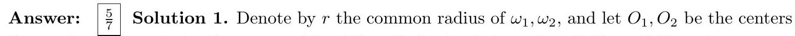 Triangle $A B C$ has $A B=4, B C=3$, and a right angle at $B$. Circles $\omega_{1}$ and $\omega_{2}$ of equal radii are drawn such that $\omega_{1}$ is tangent to $A B$ and $A C, \omega_{2}$ is tangent to $B C$ and $A C$, and $\omega_{1}$ is tangent to $\omega_{2}$. Find the radius of $\omega_{1}$.