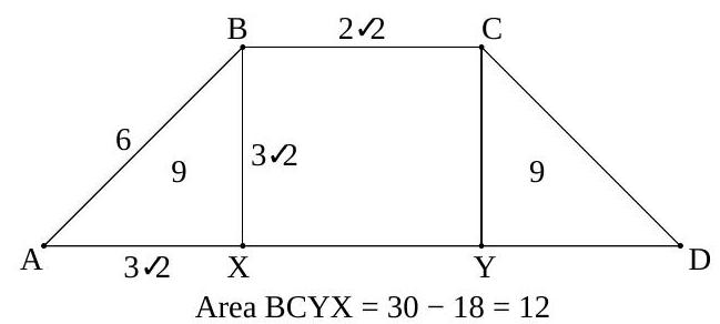 Draw altitudes from $B$ and $C$ to $A D$ and label the points of intersection $X$ and $Y$, respectively. Then $A B X$ and $C D Y$ are $45^{\circ}-45^{\circ}-90^{\circ}$ triangles with $B X=C Y=3 \sqrt{2}$. So, the area of $A B X$ and the area of $C D Y$ are each 9 , meaning that the area of rectangle $B C Y X$ is 12. Since $B X=3 \sqrt{2}, B C=12 /(3 \sqrt{2})=2 \sqrt{2}$.