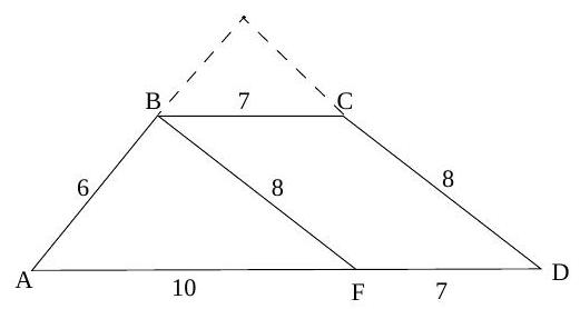 In trapezoid $A B C D$ shown, $A D$ is parallel to $B C$, and $A B=6, B C=7, C D=$ $8, A D=17$. If sides $A B$ and $C D$ are extended to meet at $E$, find the resulting angle at $E$ (in degrees).