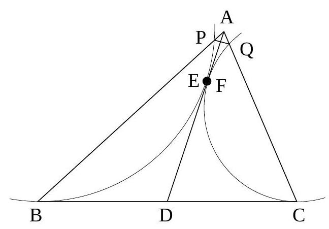 In triangle $A B C, \angle A B C=50^{\circ}$ and $\angle A C B=70^{\circ}$. Let $D$ be the midpoint of side $B C$. A circle is tangent to $B C$ at $B$ and is also tangent to segment $A D$; this circle instersects $A B$ again at $P$. Another circle is tangent to $B C$ at $C$ and is also tangent to segment $A D$; this circle intersects $A C$ again at $Q$. Find $\angle A P Q$ (in degrees).