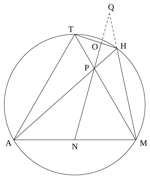 Triangle $M A T$ is equilateral, so $H M / A T=H M / M T=3 / 4$. Also, $\angle A H M=\angle A T M$, so the quadrilateral is cyclic. Now, let $P$ be the intersection of $M T, A H, N O$. Extend $M H$ and $N O$ to intersect at point $Q$. Then by Menelaus's theorem, applied to triangle