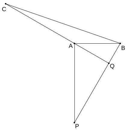 By the Law of Cosines, $\angle B A C=\cos ^{-1} \frac{3+1-7}{2 \sqrt{3}}=\cos ^{-1}\left(-\frac{\sqrt{3}}{2}\right)=150^{\circ}$. If we let $Q$ be the intersection of $\ell_{2}$ and $A C$, we notice that $\angle Q B A=90^{\circ}-\angle Q A B=90^{\circ}-30^{\circ}=60^{\circ}$. It follows that triangle $A B P$ is a 30-60-90 triangle and thus $P B=2$ and $P A=\sqrt{3}$. Finally, we have $\angle P A C=360^{\circ}-\left(90^{\circ}+150^{\circ}\right)=120^{\circ}$, and