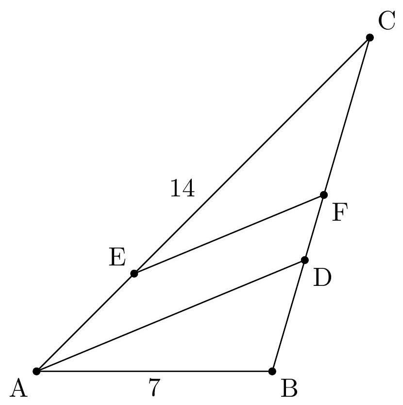 Hence (1) is equivalent to $A C=2 A B=14$. Then $B C$ can be any length $d$ such that the triangle inequalities are satisfied: