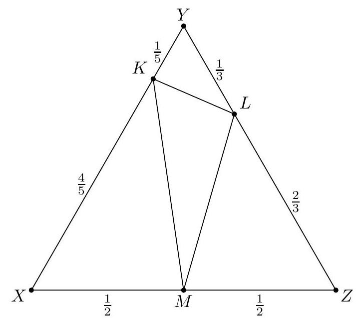 Let $X Y Z$ be an equilateral triangle, and let $K, L, M$ be points on sides $X Y, Y Z, Z X$, respectively, such that $X K / K Y=B, Y L / L Z=1 / C$, and $Z M / M X=1$. Determine the ratio of the area of triangle $K L M$ to the area of triangle $X Y Z$.